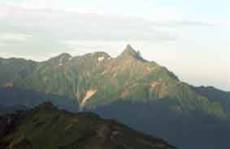 ご来光を見ようと日の出前に起きましたが、あいにく東の空に雲があり太陽が出るところは見られませんでした。しかし、天気はよく槍ヶ岳が見えました