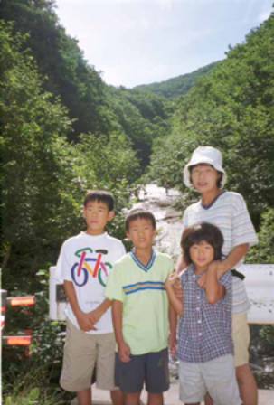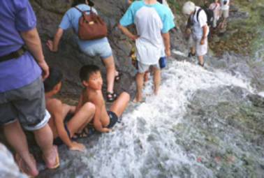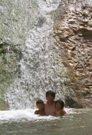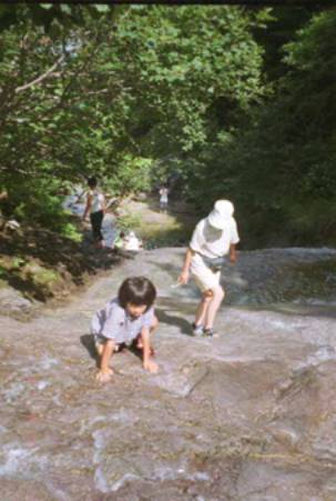 滝壺の湯船。結構人がいたけどバスの合間は人もとぎれて、大自然の中の文字通りの露天風呂。気持ちよくっていつまでも入っていたかったけど、しぶきが目に入って痛いと、健はすぐに上がってしまった。体が乾いてくると皮膚がピリピリと痛がゆくなってきて、なつみはぐずぐず言う(下りるのが怖かったのじゃないよ。私が一番上手だったよ)。