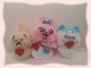 | 2月14日(土) 14:00~ ふわふわかわいい♪![]() くるくる毛糸をまいてボンボンを作り、好みの形にカットします。フエルトやボタンの 顔パーツをはりつけましょう♪ ハムスターやハリネズミ、おばんちゅうさぎが人気です♪ (ハマナカ社 くるくるボンボン使用) (材料費)1ケ200円~ (定員)6家族 ![]() ![]() R5年11月参加の方の作品💚 :親子で色違いのカモノハシに挑戦されました☆ ![]() ![]() ![]() バレンタインのプレゼントにも♪ 予約の時、何色を作りたいか決まっていたら教えてね♪ 当日、可能な範囲の変更はできるよ。