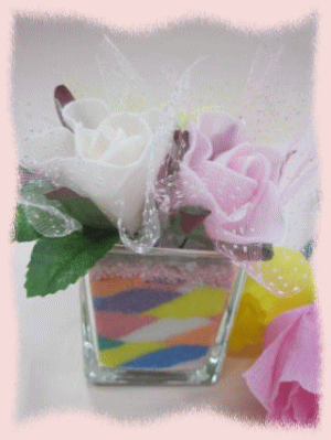 好きな色のカラーサンドを重ねて土台を作り、春色のフェイクグリーンやピックを刺してかざりましょう♪