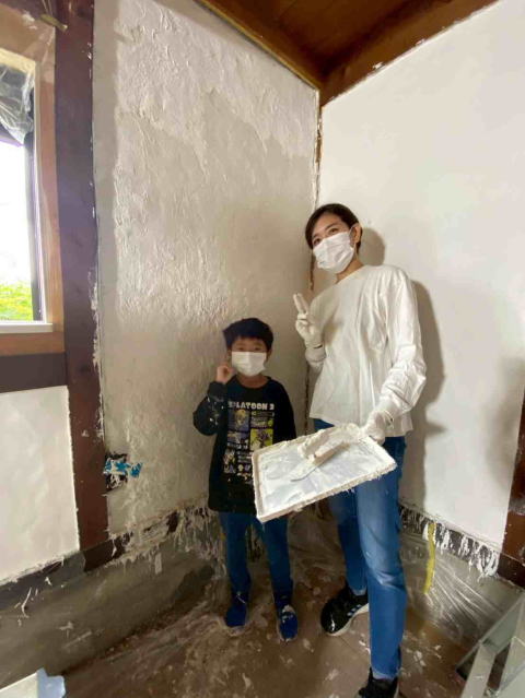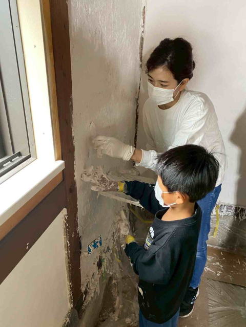 本日は、茂木様、中川様です。慣れないコテを使いながらお母さんたちが壁に付けた漆喰を左右に動かして楽しそうに作業してくれました。