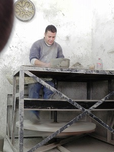 無事に塀の外へ生還してから、職人が頑張っている一角を訪ねました。 フェズは金属製品、皮製品、陶器、・・などを作る沢山の職人が住んでいる街 です。今回も陶芸仲間が一緒でしたので、陶器の製作現場に興味がありました が、見かけたのは伝統的な製品だけを作っている現場でした。