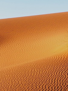 アトラス山脈の西側は緑 に包まれていましたが、山 を越えると荒涼とした大地 が広がっていました。 ←遠くに白雪の山を見ながら エルフードを目指す 3.砂漠の夜明け エルフードのホテルに泊まった翌朝は砂漠見物です。 砂漠で日の出を見るため、朝5時頃ホテルを出発しました。トヨタの四駆ラン ドクルーザーに分乗して暗い夜道を疾走しました。道と言っても道なき荒地で す。標識も家も樹木もない平地です。先導する車の後ろに数台が連なって進み ました。 多分時速80キロ以上で1時間近く走り、目的地に着きました。 アルジェリアとの国境に近い場所です。小さな小屋が1軒建っていました。 ここから砂丘の上まで歩きです。足の弱い人のために駱駝が待機していました。 砂漠は気温の寒暖が半端ではないと聞いていましたが、長袖のシャツとウイン ドブレーカーが必要でした。 砂に足を取られながら20分近く歩き、砂丘の上に到着しました。