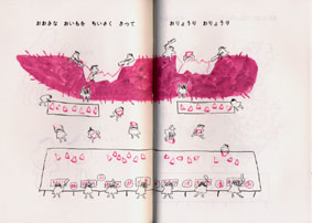 | もうむちゃくちゃ大きくなったおいもを、どうやって 掘って、どうやって運んで、どうやって洗って、・・・・ 園児たちの荒唐無稽な発想に脱帽! このお話は、実際の保育現場からうまれたそうです! |