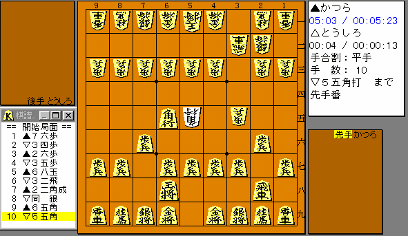 川谷迷人と何局もやった升田式石田。川谷迷人のHPで研究されたかと 思いながらの対局でした。▽55角といきなり打ちかえされましたが・・ ▲77桂 ▽36歩 ▲同歩 ▽同飛 ▲37歩 で▽76飛と回れないので何事もなく43の馬が活躍して快勝!