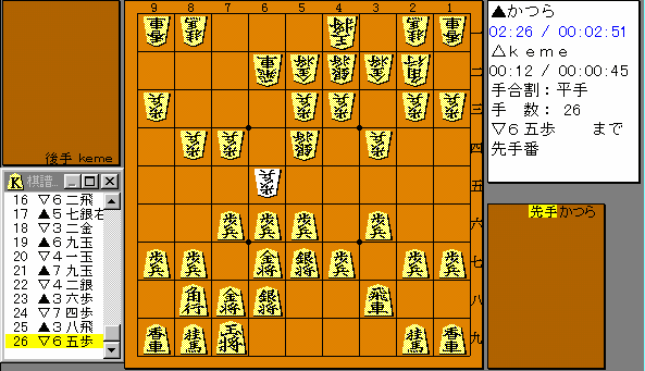 kemeさんとの将棋は急戦矢倉。これまでの経緯から 相掛りと思っていたので予定外。 桂馬はねずにいきなりの▽65歩! 1手前の38飛車が危険だった意味はあるのですが・・・ ▲36歩を急がずに▲26歩〜25歩が多いですか? 詳細棋譜は図中の棋譜ボックスを参考にしてください。 |