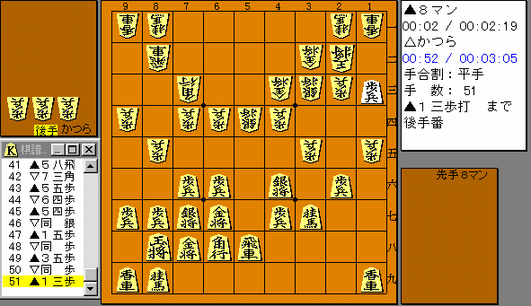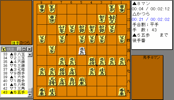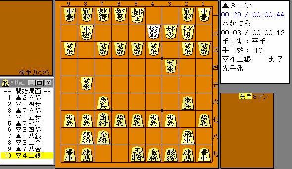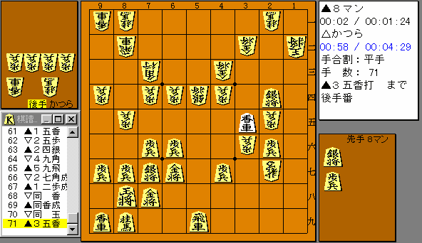 角換り模様・・・特にメリットもないのですが▽77角成 と指さずに▽42金! 30秒くらい時間使ってくれたらくらいの気持ちでたまに やります。 ところが8マンさん反発してか突然矢倉に・・・まぁ後手 としては飛車先突かせているので得した気分。 |