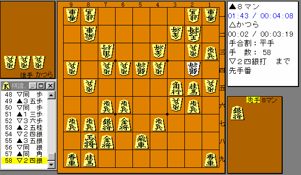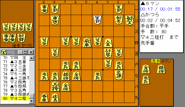 ▽42桂でもしや・・・・とおもいましたが角をとられて ▲34角以下寄せられました。逆転の余地もあったかも しれませんが前譜35香のところで時間つかってしまい、 この辺で残り5分くらい・・・・・どっちにしてもだめ でした。 しかし、矢倉連敗・・・・調子悪い(^^; |