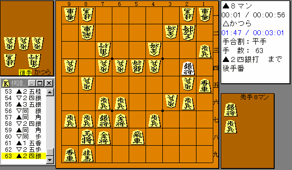 ▲35香〜▲32銀がきびしすぎてどうにもなりません。 ▽51角から粘りにでましたが・・・・ |