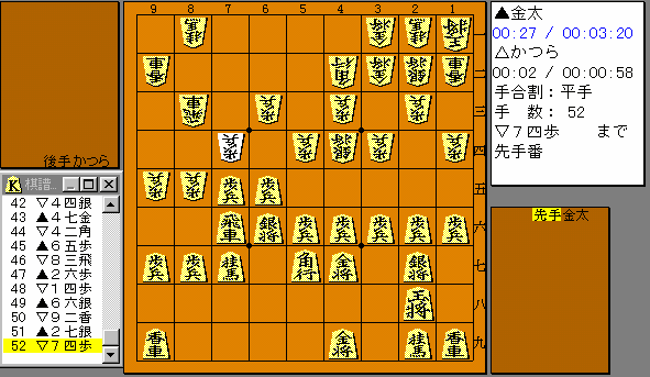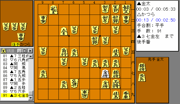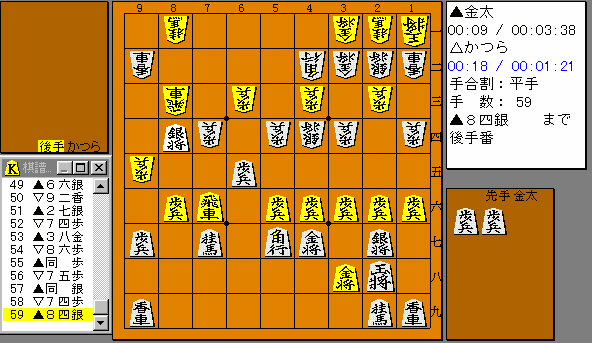 この▲37金が鍛えがはいってるっていう感じ。この局面かなりで難しく なっているようです。(すでに逆転してるかも?) 以下▽57馬以下こちらも粘って最終盤は受けきっていたかも?の局面は あったものの(金太さん指摘の▽21玉)足りませんでした。 やっぱり終盤は10級ですねぇ。 |