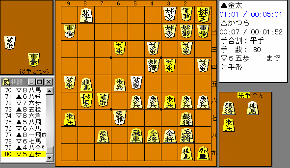 ▽55歩ではっきり優勢(っといってもわかりやすい1手勝ち程度)と感じ てました。先手は美濃囲いですが”相穴戦桂香より5筋”という格言もある ほど? ただCAMEL戦同様終盤力が同じならということなんですけど。 |