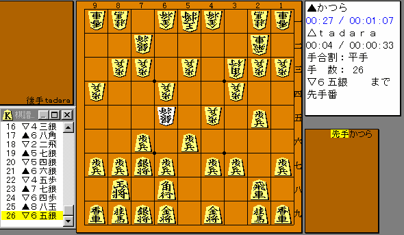 リーグ戦も最終盤。戦跡は3勝4敗。トーナメント出場の目も降級(ん? そんなもんあったっけ?ま順位戦の気分ってとこか)の目もなくちょっと 雑な序盤。銀でられると56の歩をとられるのは解っていたが居玉のまま でやってこないだろうと思って安易に角筋に玉はいったのは失敗でした。 それでもまぁ固めれば1歩くらいたいしたことないかともおもったのだが ▽55角がいつでもあって▲36歩が突きづらくてまいった。やっぱり、 歩を粗末にしてはいけないのであった。序盤はそんなこんなで書くことが ないんでしょうがなく最終盤の図面でも載せようかと思ったのだが・・・ 終盤の局面まで並ばない。3〜4日たってるとはいえまったくお粗末。 やっぱり終盤は何も考えて指してないってことか(^^; |
