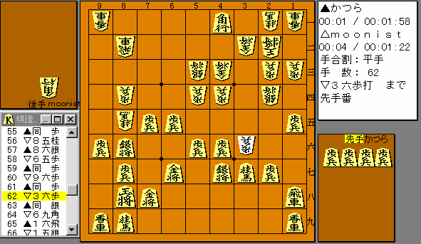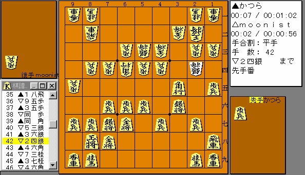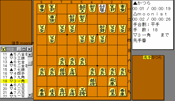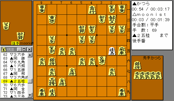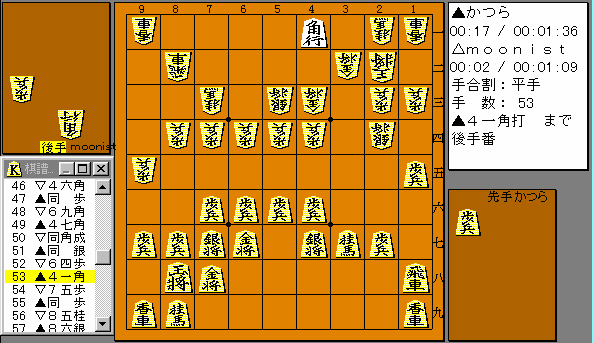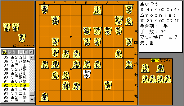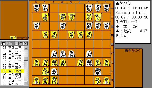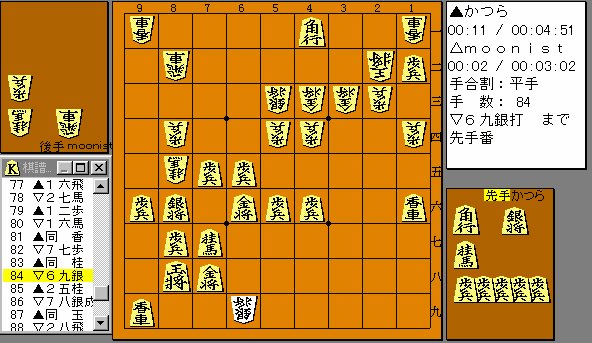 最終戦は四国の代表とうわさされるmoonistさん。局面は矢倉へ。 後手のmoonistさんはさっそく工夫を披露。早囲いにして定跡型を はずしてきた。 矢倉の定跡型のほとんどは先手有利。後手矢倉はどこで定跡型をはずすか から始まるのである。 |