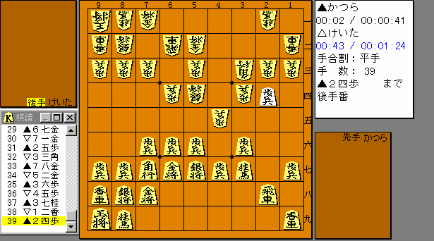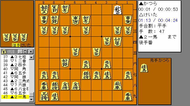 かなりの歩損だったが成った角で桂馬をとれて一応成功。 押え込まれて気分は悪いがこれ以上後手から手が続かないみたい なので駒得が大きそう。あとは暴れてくるのをめんどうみて・・