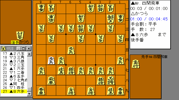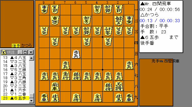 ▽12香のときに▲65歩は穴熊全盛のころの初期の対策。最近あまり みなくなった。普通は四間飛車なので▽44歩以外穴熊に組みにくいが 向かい飛車なので▽44銀で大丈夫だった。(ちょっと反省) 本譜は後手から角交換。 |