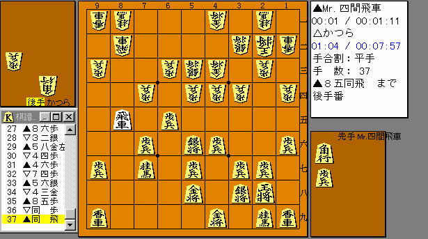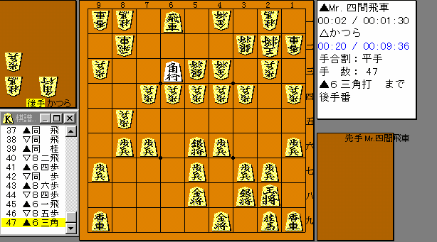 これで決定的な大差!しかし将棋はわからないものでなんと84にうって 桂馬をとった歩(いまは85)がと金になってなんと46まできて▽36 歩の合わせからこめかみ1点攻撃で大逆転。失礼しましたー(^^;。 |