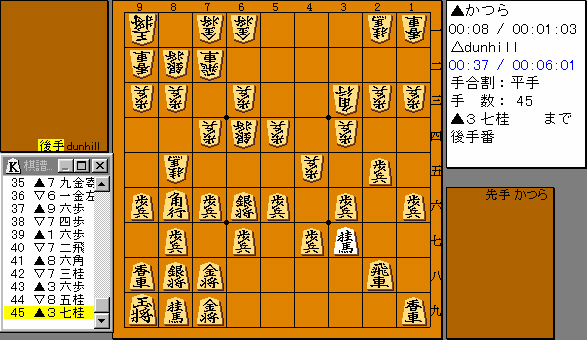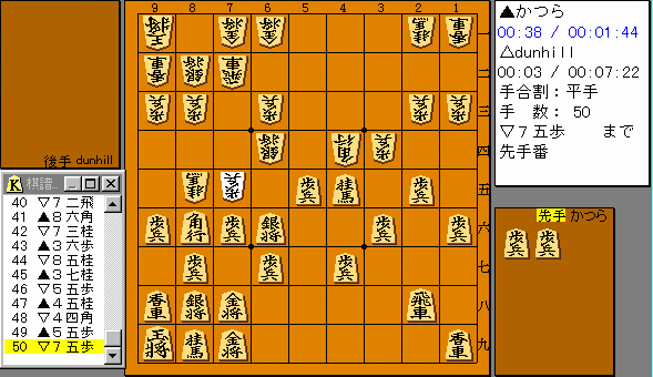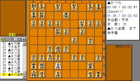 よさそうなのでちょっと悩んだ局面だが▲54歩から1直線に 攻めあって勝ち。 dunhillさんとしては力がだせなかった1局 だとおもう。 |