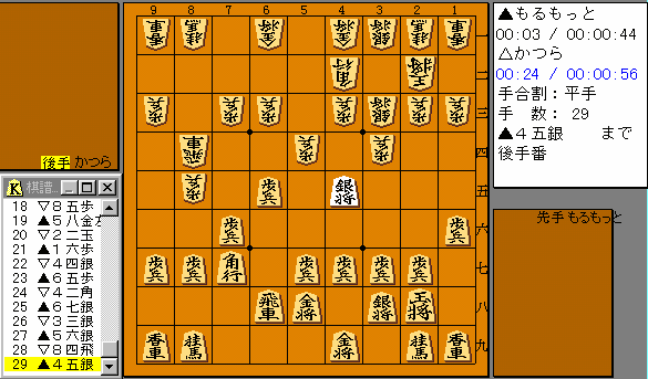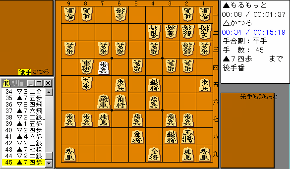 とりあえず先勝できたので2局目は目いっぱい穴熊を目指そうと ▽84飛。▲45銀に先に備えているのにでてこられるとちょっと むっとする局面。 |