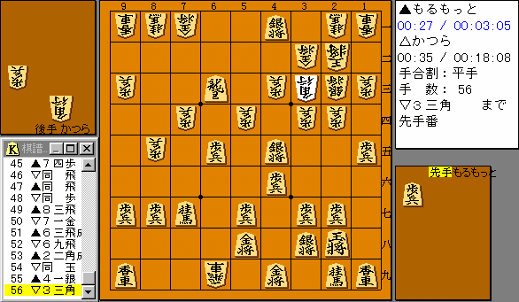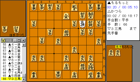 角を切ってもらったので後手にも希望が・・・・。 ▲84角と逃げて▲72歩とか▲73歩と金をせめられたら 完封負けのようだ。しかし▽33角は横着だった。先に▲32 銀成とされると▽同玉には▲52竜〜▲53金、▽同銀には、 ▲34銀、▽77角成、▲43竜!で寄ってたみたい。 とにかく助かった。 |