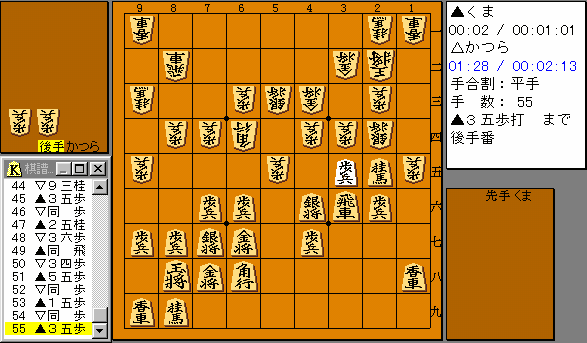 第1局は相矢倉。△36歩〜△34歩は常用の受けだが▲38飛車を はぶいていきなり▲35歩はおどろいた。しかし結構うるさいようだ。 |