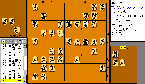△33歩が敗着になるべき1手。▲12歩〜端を攻められていれば どうしようもなかった。本譜は▲34歩だったので一応顔は立った。 戻って上の局面では△24角〜飛車先連打して△56歩の構想なら 後手もさせていたようにおもう。 |