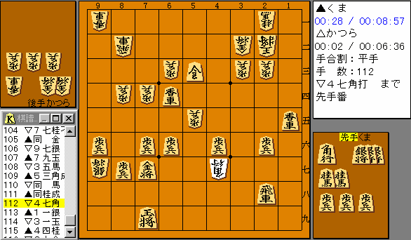 それでも局面は不利のまま最終盤へ・・・ 先手の駒は左右の桂香まで目いっぱいさばけている。後手は64の香が とれていない分と91香が先手の15香より働きが悪い(悪いといって もその位の差か?) △47角は最後のお願い・・詰まされても文句の言えない局面でもある。 ・・・・が先手は▲11銀〜44桂!△69銀、▲78玉、△68金打、 ▲89玉、△79金寄まで頓死してしまった。△69金に単に▲89玉 も▲79金打から98でばらして91香、82飛が働いてぴったり詰む ようである。拾わせていただきもうしわけありませんでしたn(_ _)n |