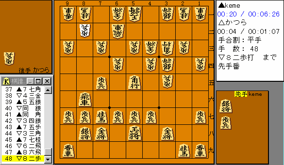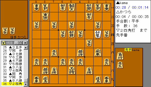 kemeさん得意?の相掛り37銀!。▲16歩を省略しての攻めが 先手の工夫。はたして成立するんだろうか?1歩得を主張して▲24 角だが・・・・ちょっとがんばりすぎたか? |