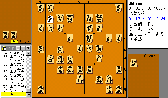 先手の第2波攻撃!ただ右側が優位なだけに気分は楽。 結局、このあと先手の飛車先を逆襲して83の歩がと金に成長。 |