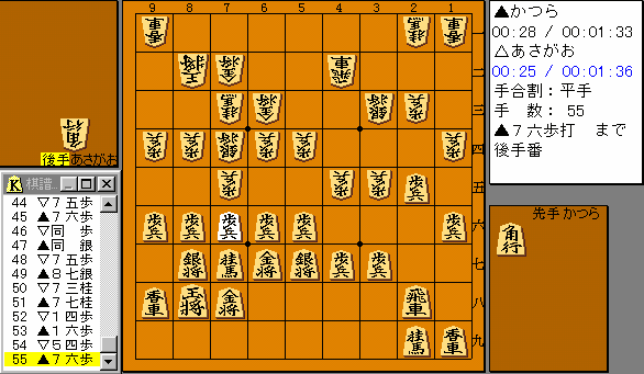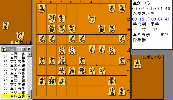 動かす駒がないのは後手も同じこと。パスする手がないので▽83銀と 位を放棄。位がとれてはいいように思うのだが1歩持って▽38歩など の筋を狙っている。ゆっくりはしていられないのでこちらから動く。 |