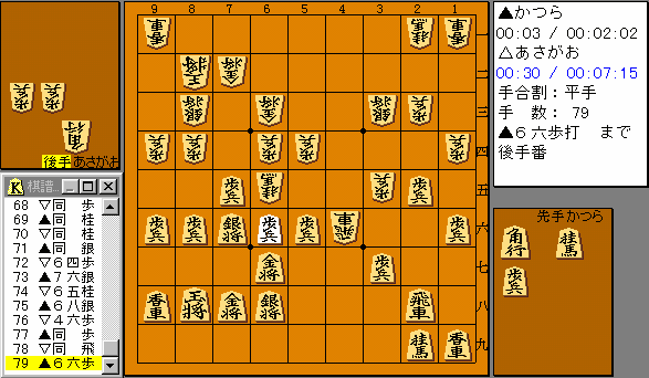 ▽65桂からの反撃だが落ち着いて桂馬を殺して優勢とおもう。 ところが▽49飛成の局面になにを血迷ったか▲79桂と受けて しまい▽77歩とうたれてげーっ。 この瞬間だけ7筋に歩が効くのを・・・・・・ |
