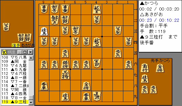 必敗形だったがすこしゆるめてもらい飛、馬が働いてきて勝負形。 ▽46桂の瞬間が”ぜ”なのでとりあえず攻めてみる。 受け間違えてくれたようでこの▲93桂で完全に逆転。 めずらしくきれいに寄せたのでおもわず載せてしまいました(^^; |
