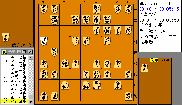 途中▽55歩で角筋をとめてほっと一息もつかの間、2次攻撃が 来る。ただこの▲35桂は疑問のようだ。▲46桂なら自陣の傷 も消していて後手全く自信なし。 本譜は▽33金〜△34歩で攻めがきれてしまった。 ひやひやの2回戦突破。ふぃ〜。 |