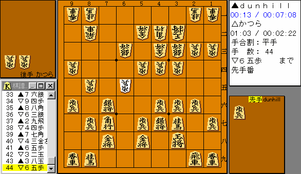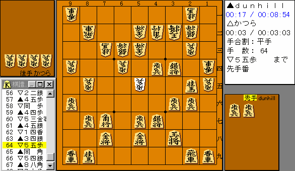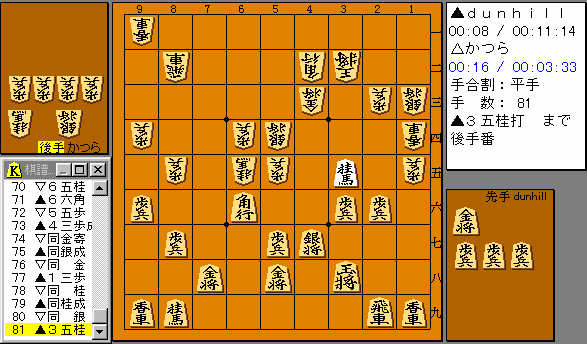 端攻めから流れるような気分のいい攻め。ここではほとんど サンドバック状態。まぎれを求めて▽55歩だが・・・・ |
