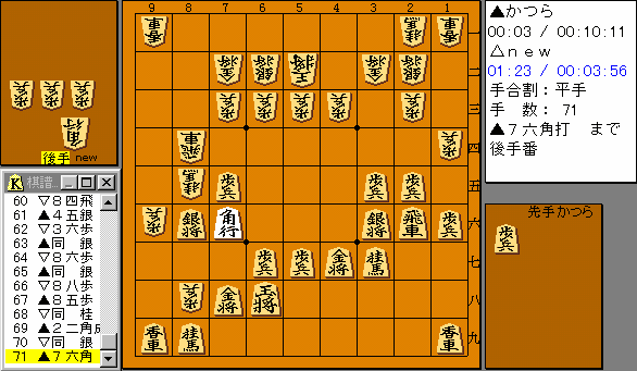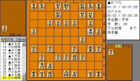 準決勝はfuru(古)さん改めnew(新)さん。 newさんの選択は相掛り。こちらとしてみればここが最初の選択。 いつもなら売られたけんかは買う方なのだが少しひるんでしまった。 取って▲84飛で悪くないと思うのだが▽71金▲24飛▽15歩や ▽26飛の打ち返し(▽39金にはすぐ角交換から28角)など読む のがおしくて(短い時間の将棋なので)さけてしまった。 |