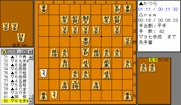 待望の反撃・・・でいちおう勝負形。 攻めを呼び込んでいる形なので自信があるわけではないが序盤の 不利からみれば光明がみえてきた。 |
