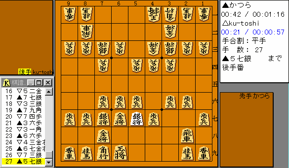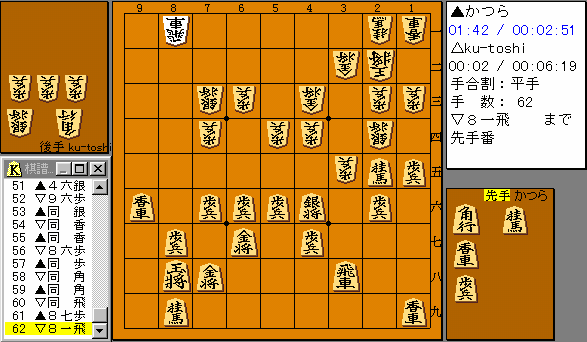 ▲87歩に香はとりにくい。手番をもらって▲72角で優勢かな? とおもったが打った角はなぜか62に・・・???状態のまま投了と なってしまいました。みなさんマウスミスには注意しましょう! 局面自体は82に飛車を引いていても61角で先手優勢とおもうので ▲72角には▽71飛▲63角成が予想されるがこれも自信あり。 結局73に銀が残っては後手つらそうが結論? |