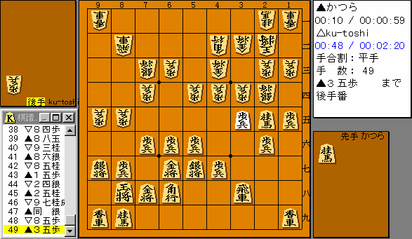 おたがい46銀型の同じような攻め筋を見せつつの駒組み。 後手が先に端から動く。桂馬の成り捨てから▽85歩はよくある筋。 こちらも手筋の▲35歩から反撃。同銀には▲13桂成の予定。 |
