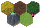 | 移動の例 赤のプレイヤーは羊(移動)・鉄(移動)・麦2(取る) を支払えば緑の駒をとることができます。 ほかにはたとえば泥4(移動に2枚:取るに2枚)でも 同じようにとることができます。 ただし取るのに同一資源がいりますので羊2(移動2)の あと鉄+麦では緑の駒をとれません。 緑のこまがもし王駒なら最初の例では羊・鉄・麦3が必要 です。もちろん泥5でも取れます。 | |||