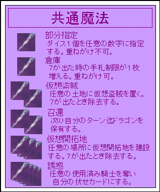 必要なもの ・カタンの開拓者基本セット ・追加の2または12チップ ・魔法都市タイル1(カタンブックにありますがなければ砂漠で代用など) ・金鉱川タイル2 ・金専門港(作るか海タイルにシールかなにかを貼って区別してください) ・仮想盗賊を示すマーカー(海賊駒など) ・ドラゴンの所有を表示するもの。(カタンブックのドラゴン駒がベストかと思いますが なんでもいいです) ・各職の仮想開拓地・仮想街道を示すマーカー(船駒とかがいいとおもいます) ・倉庫を示すマーカー(これも船駒でいいですが他でも可) ・魔力カード19枚、砂金カード19枚(下記を参考に作成してください。または騎士カ タンの他のカードなどで代用してください) ・共通魔法カード4枚(下記をコピーしてください) ・魔法使いカード6枚(下記をコピーしてください) |