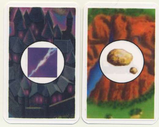 通常資源を多く持って基本戦術をとったプレイヤーが先行して金や魔力をもつプレイヤーがお いかける展開が一般的ですが全体的に通常資源のタイルが少ない分序盤はゆっくりした展開に なるようです。魔法は直接発展の役にたつものは少ないので魔力や金を重視しすぎると出遅れ るもとになるかもしれません。序盤の魔力や金はどちらかというとバースト対策の手札調整に 使われることの方が多いかもしれません。 作戦的には部分指定(共通魔法)は配置でとる目を工夫すればかなり使えるかも。また2や12 の場所や3、11のセット目などを有効に活用してみる目的で使える魔法かもしれません。資源 のタイルが少ない分これでレアな目も有効に活用しましょう。 反面後半は騎士王が移動しやすく、また仮想盗賊などを使ってトップをとめやすいため叩きあ いになる公算大です。逆転要素も多く、序盤出遅れなければスリリングに楽しめるかと思いま す。 ゲームを通して魔法使いは必ずしも必要なわけではありませんが通常5種のタイルが減った分、 金や魔力の用途として持っておくと何かと便利でしょう。 基本的にカタンカードゲームの魔法使いとドラゴンをボード風にアレンジしましたがドラゴン のルールは適用しなくてもプレイ可能です。 |