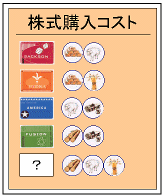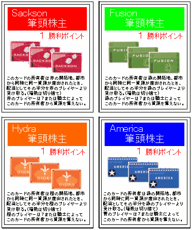 必要なもの カタンの開拓者基本セット (できれば5−6人セットの緑の駒セット:緑があれば白の駒は使いません) 株券4種類(赤橙青緑)各25枚 (アクワイヤ新バージョンのSackson,Hydra,America,Fusionを使用します) |