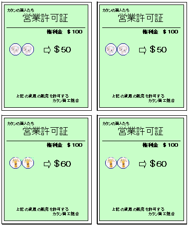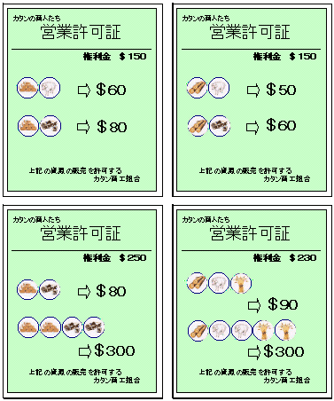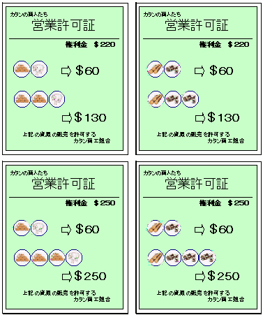 必要なもの ・カタンの開拓者基本セット ・紙幣:$10,$20,$50,$100を15枚ずつ程度($500もあればいいかも) →モノポリーの紙幣を流用すればいいとおもいます。 ・下の販売権カード(営業許可証)12枚と建設コストカード (コピーして厚紙にでも貼ってください) |