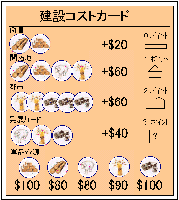 建設コスト 道 =泥木+$20 開拓地 =泥木麦羊+$60 都市 =麦麦鉄鉄鉄+$60 発展カード=麦羊鉄+$40 |
