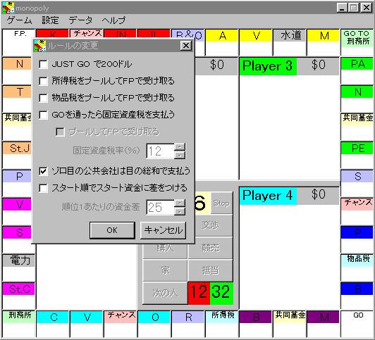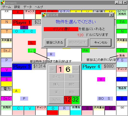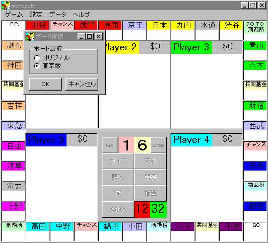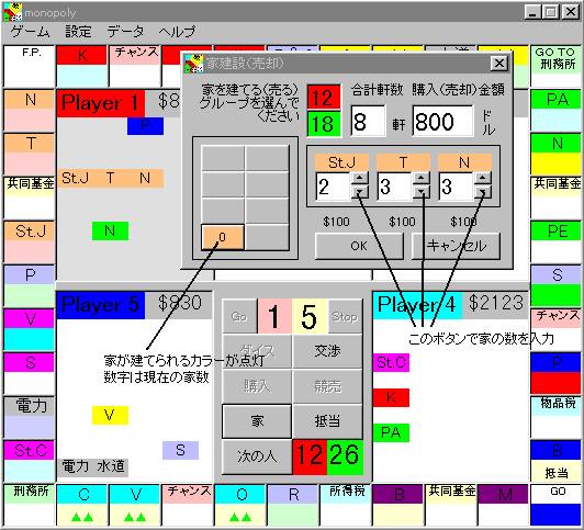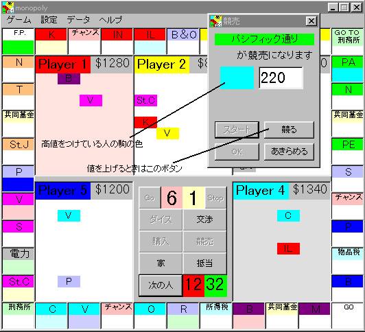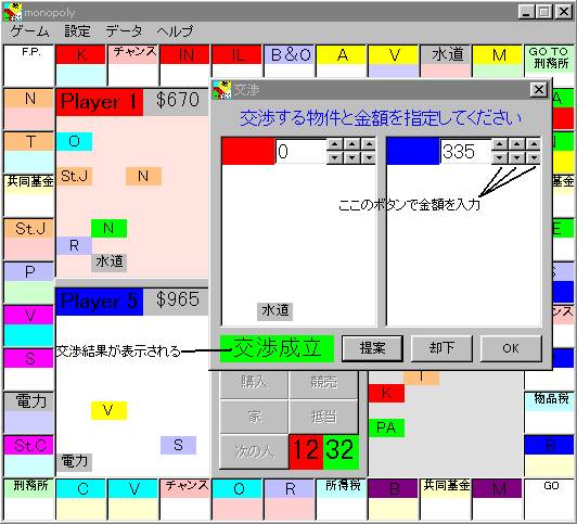 モノポリーになくてはならない交渉画面。交渉相手と物件、金額を 指定して・・・・提案。結果は・・・・? 当然PCプレイヤー同志の交渉もあり、内容、結果が表示されます。 交渉相場は神だけが知る・・・?作者も少しはわかるけど。 |