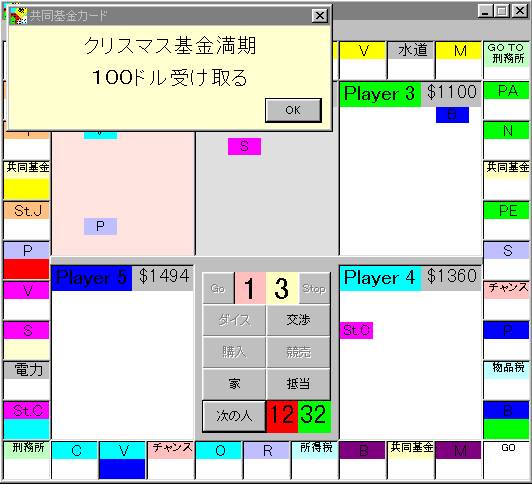 カードに止まったときはカードがめくられ表示されます。 OKを押すと指示のとおり現金授受や駒の移動が行われます。 |