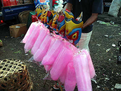 いつものように市場に買物にいったところ、綿飴売りお兄さんに遭遇。昔が懐かしく、思わず一袋買ってしまった。一袋Rp2000(約25円)